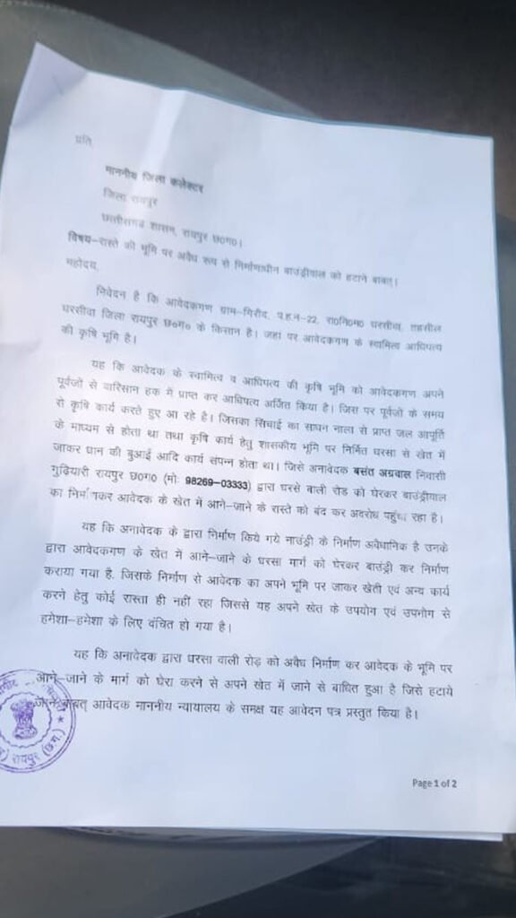 रायपुर, 22 जनवरी। गिरौद (धरसीवा) के प्रभावित किसानों ने बुधवार को कलेक्टर रायपुर को ज्ञापन सौंपकर जमीन कारोबारी बसंत अग्रवाल के खिलाफ गंभीर शिकायत दर्ज कराई है। उन पर सरकारी जमीन पर बाउंड्रीवॉल बना रास्ता रोकने का आरोप है। इस पर किसानों ने कार्रवाई की मांग की है।