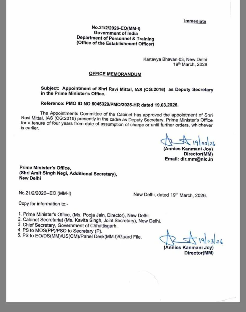 IAS Ravi Mittal : रायपुर। केंद्र सरकार ने छत्तीसगढ़ कैडर के 2016 बैच के आईएएस अधिकारी Ravi Mittal को Prime Minister’s Office में डिप्टी सेक्रेटरी पद पर नियुक्त किया है। यह नियुक्ति Appointments Committee of the Cabinet की मंजूरी के बाद की गई है। IAS Ravi Mittal