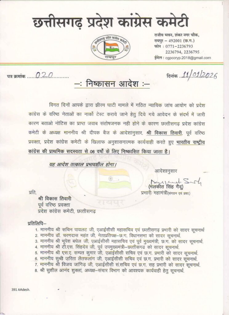 रायपुर। छत्तीसगढ़ की राजनीति में एक बार फिर झीरम घाटी कांड सुर्खियों में है, लेकिन इस बार वजह कोई नई जांच नहीं बल्कि कांग्रेस के ही पूर्व वरिष्ठ प्रवक्ता विकास तिवारी हैं। झीरम घाटी कांड को लेकर दिए गए उनके एक बयान ने पार्टी के भीतर भूचाल ला दिया और आखिरकार कांग्रेस ने उन्हें 6 साल के लिए पार्टी से निष्कासित कर दिया।