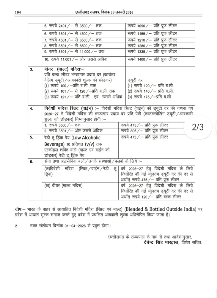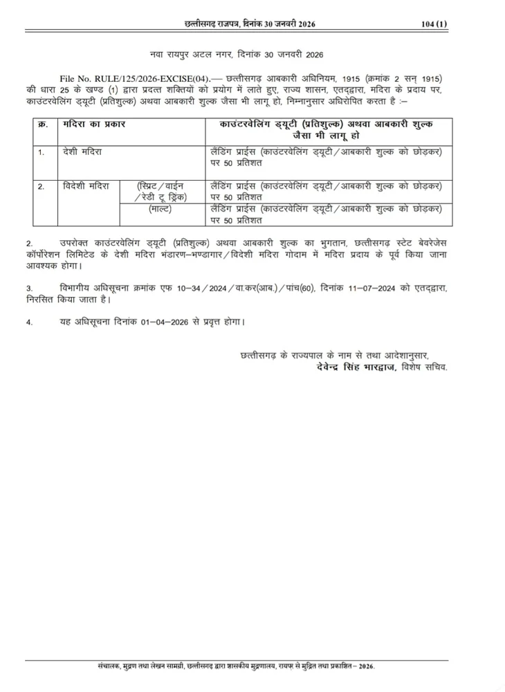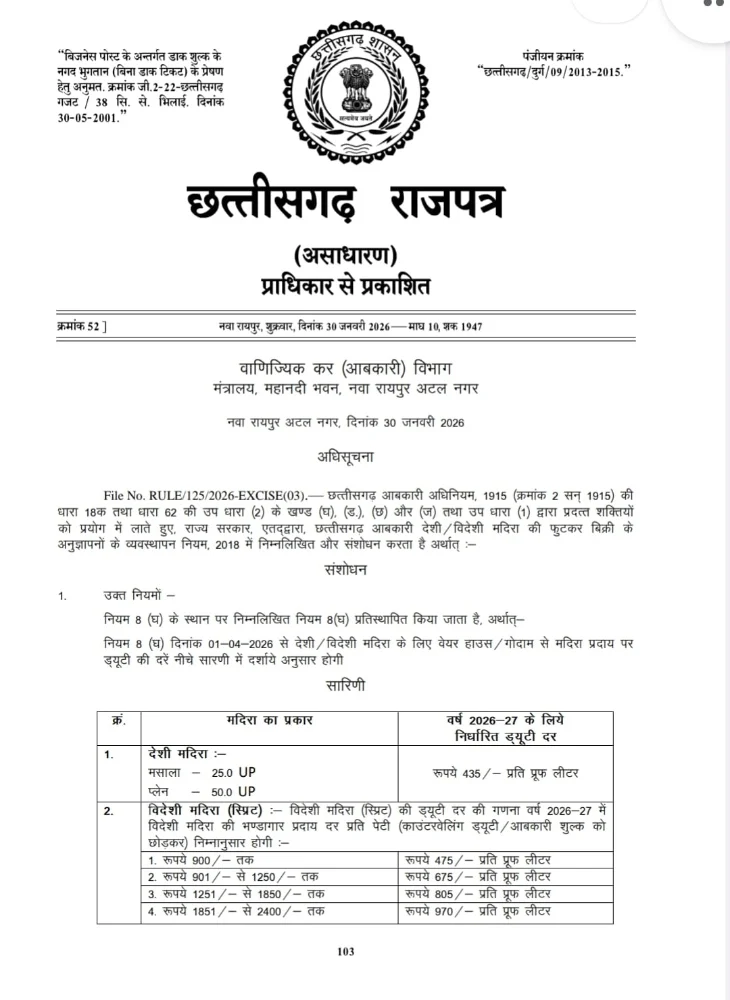 रायपुर। Liquor Price Hike in CG: छत्तीसगढ़ में शराब पीने वालों के लिए अहम खबर है। साय सरकार ने नई आबकारी नीति के तहत शराब पर लगने वाली ड्यूटी दरों में बदलाव कर दिया है। नई दरें 1 अप्रैल 2026 से लागू होंगी। राजपत्र में प्रकाशित अधिसूचना के मुताबिक अब देसी और विदेशी दोनों तरह की शराब पर कीमत के आधार पर टैक्स लगाया जाएगा, जिससे आने वाले समय में शराब की कीमतों में बढ़ोतरी तय मानी जा रही है। Liquor Price Hike in CG