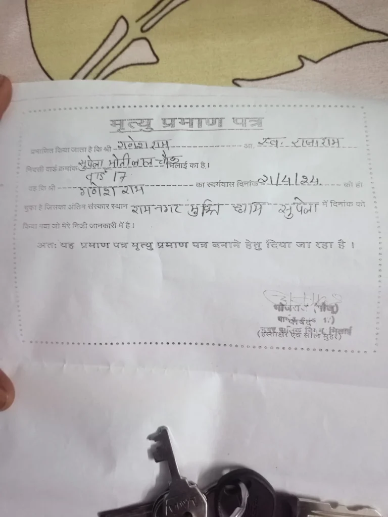 जानकारी के अनुसार गणेश राम, निवासी सुपेला मोतीलाल चौक, वार्ड क्रमांक 17, का निधन 21 अप्रैल 2024 को हो चुका था। उनका अंतिम संस्कार रामनगर मुक्तिधाम में किया गया और मृत्यु प्रमाण पत्र भी जारी हो चुका है। इसके बावजूद 7 दिसंबर 2025 को उनके नाम पर मेडिकल सर्टिफिकेट जारी कर दिया गया, जिसने पूरे सिस्टम पर सवाल खड़े कर दिए हैं।