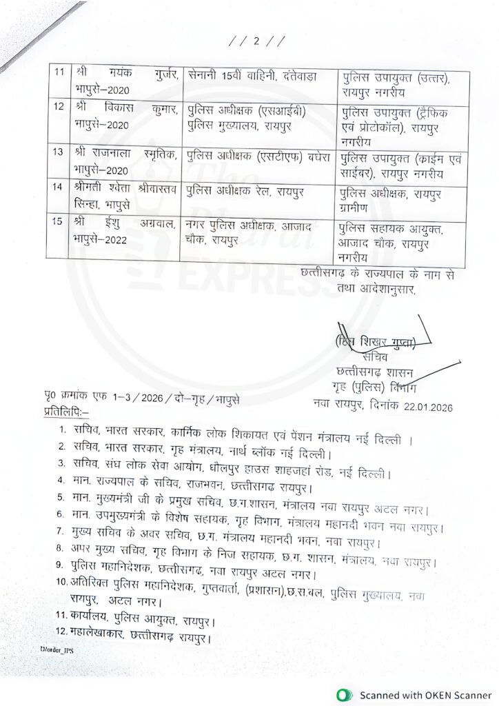 गौरतलब है कि राज्य सरकार ने रायपुर शहर में पुलिस कमिश्नरी सिस्टम लागू करने का निर्णय लिया है, जो 23 जनवरी 2026 से प्रभावी होगा। इसके तहत—