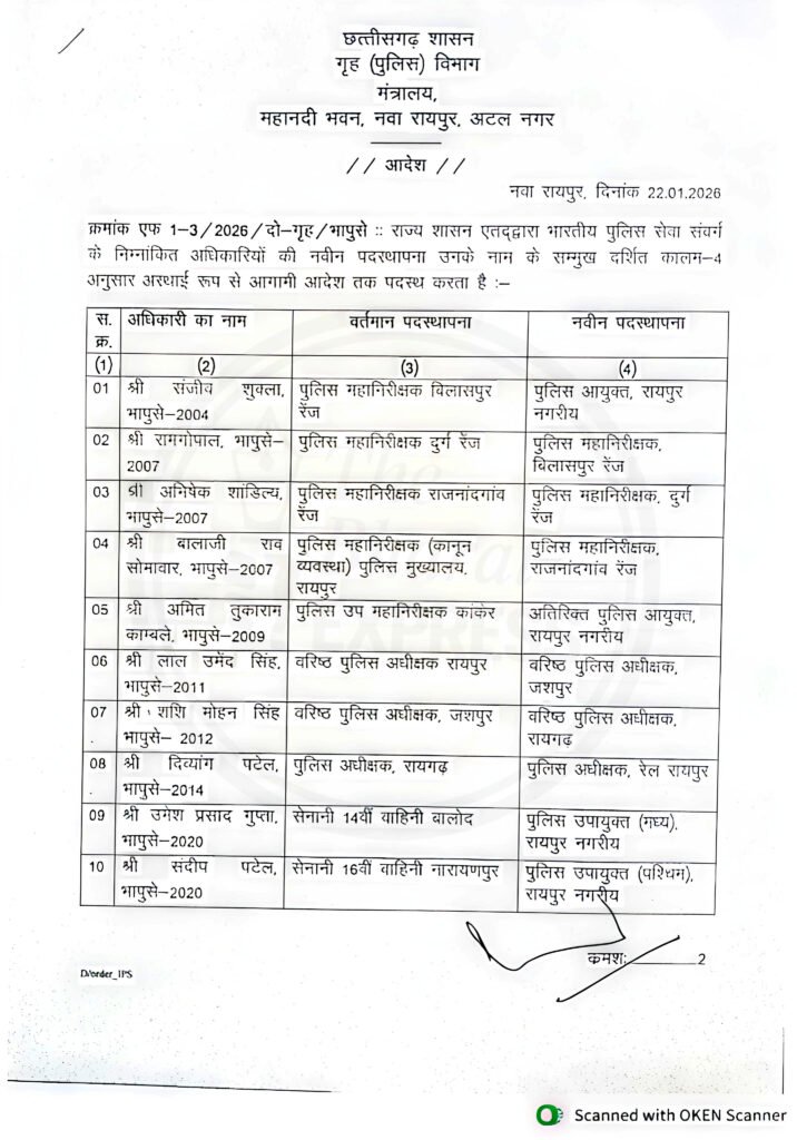 RAIPUR COMMISSIONER LIST: डॉ संजीव शुक्ला रायपुर के पहले पुलिस कमिश्नर बने, कई IG और SP का भी ट्रांसफर…. देखे List